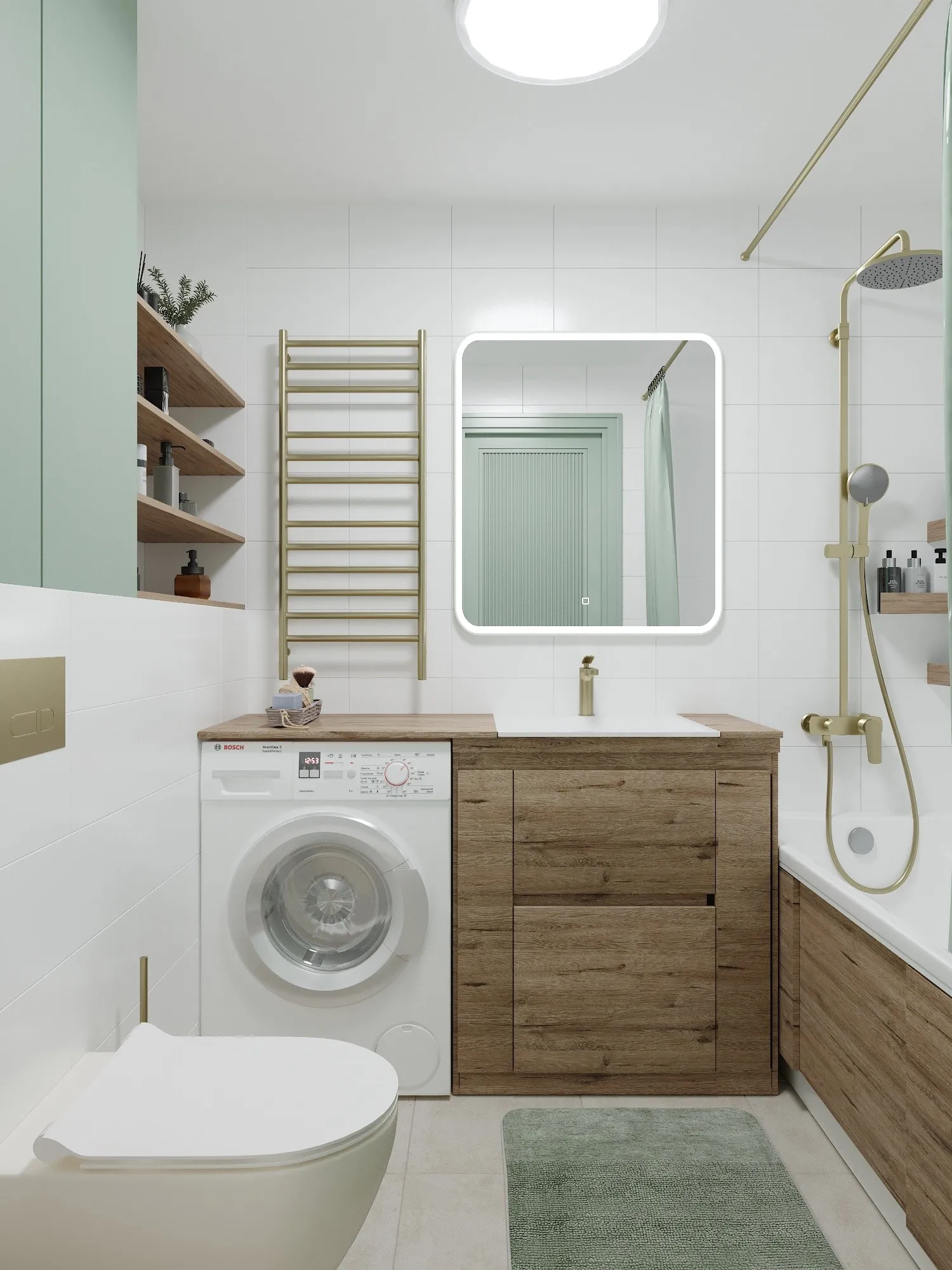 В маленьких квартирах часто отказываются от ванной в пользу душевой кабины, чтобы поставить стиральную машину. Мы же сохранили ванну длиной 1700 мм. Это повышает статус квартиры, так как многие арендаторы принципиально ищут варианты с ванной. Стиральная машина размещена под единой столешницей с накладной раковиной. Это классическое, проверенное временем решение для экономии места. Над инсталляцией предусмотрен шкаф для бытовой химии, закрывающий коммуникации.