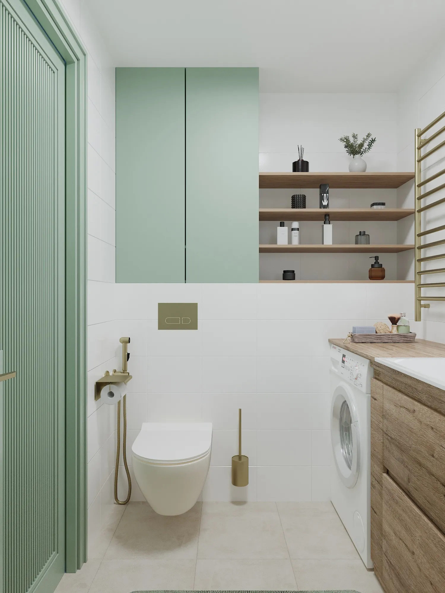 Детали: Фурнитура и смесители в цветах «матовое золото» и «бронза» добавляют интерьеру лоска, уводя его от ощущения «эконом-ремонта».