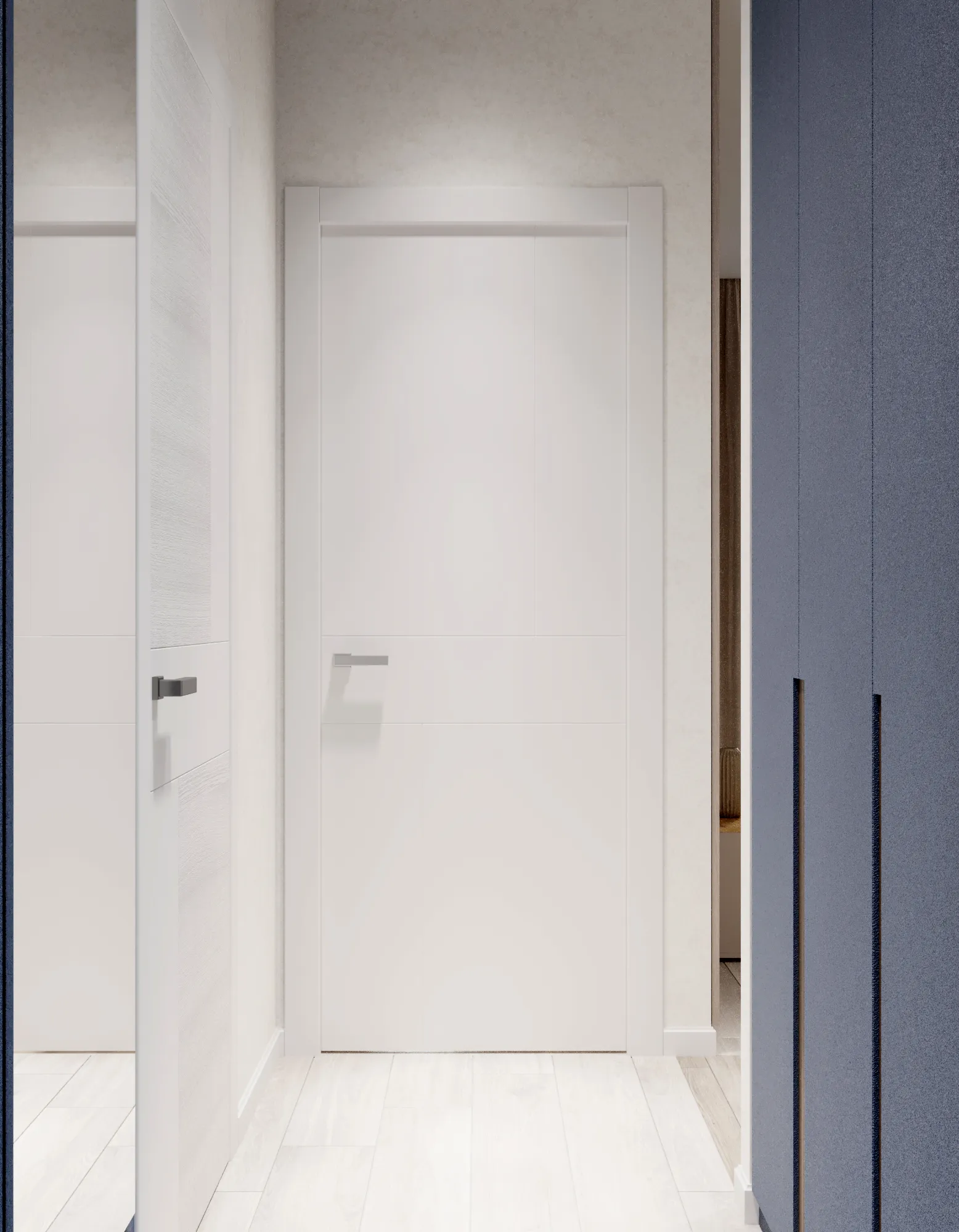 Театр начинается с вешалки, а удобная квартира — с прихожей. В маленьких квартирах грязь с улицы часто разносится по всему дому. Чтобы избежать этого, мы жестко зонировали входную группу. Напольное покрытие здесь — практичный керамогранит, который четко очерчивает границы «грязной зоны». Мы спроектировали нишу под встроенный шкаф до потолка. Это не просто место для курток. Внутри скрыт электрический щиток и слаботочный узел (роутер). Такое решение убирает визуальный шум: никаких висящих проводов и мигающих лампочек, только чистые линии мебельных фасадов.