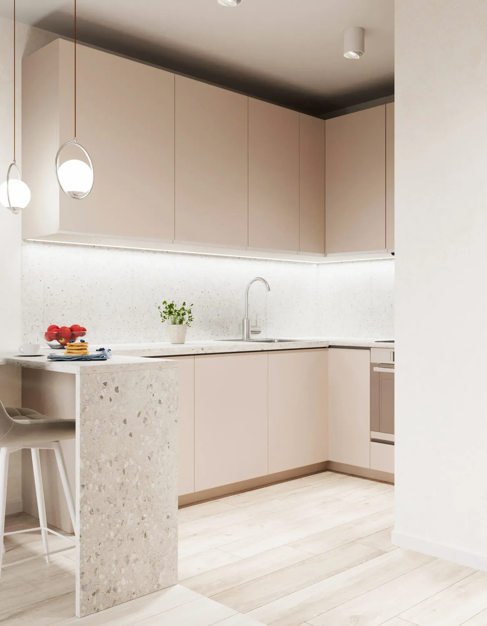 Функциональный свет: Яркая светодиодная лента в профиле над рабочей столешницей кухни. Готовить в полумраке — вредно для глаз и опасно.