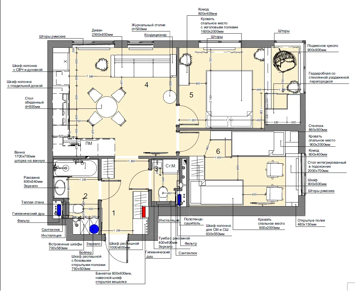 Исходные данные были непростыми: общая площадь 56,9 м² и задача разместить семью из четырех человек. Нам предстояло не просто «расставить мебель», а создать полноценное, функциональное пространство, где у родителей будет своя спальня, у детей — свое пространство для игр и учебы, а у всей семьи — общая зона для встреч. И все это — в рамках бюджета 2 млн рублей и в стилистике спокойного эко-минимализма.