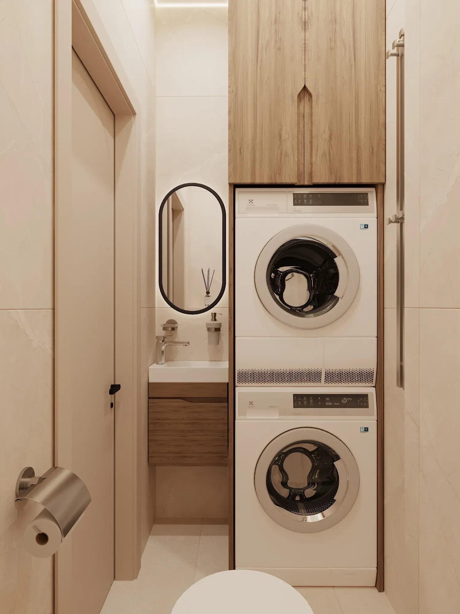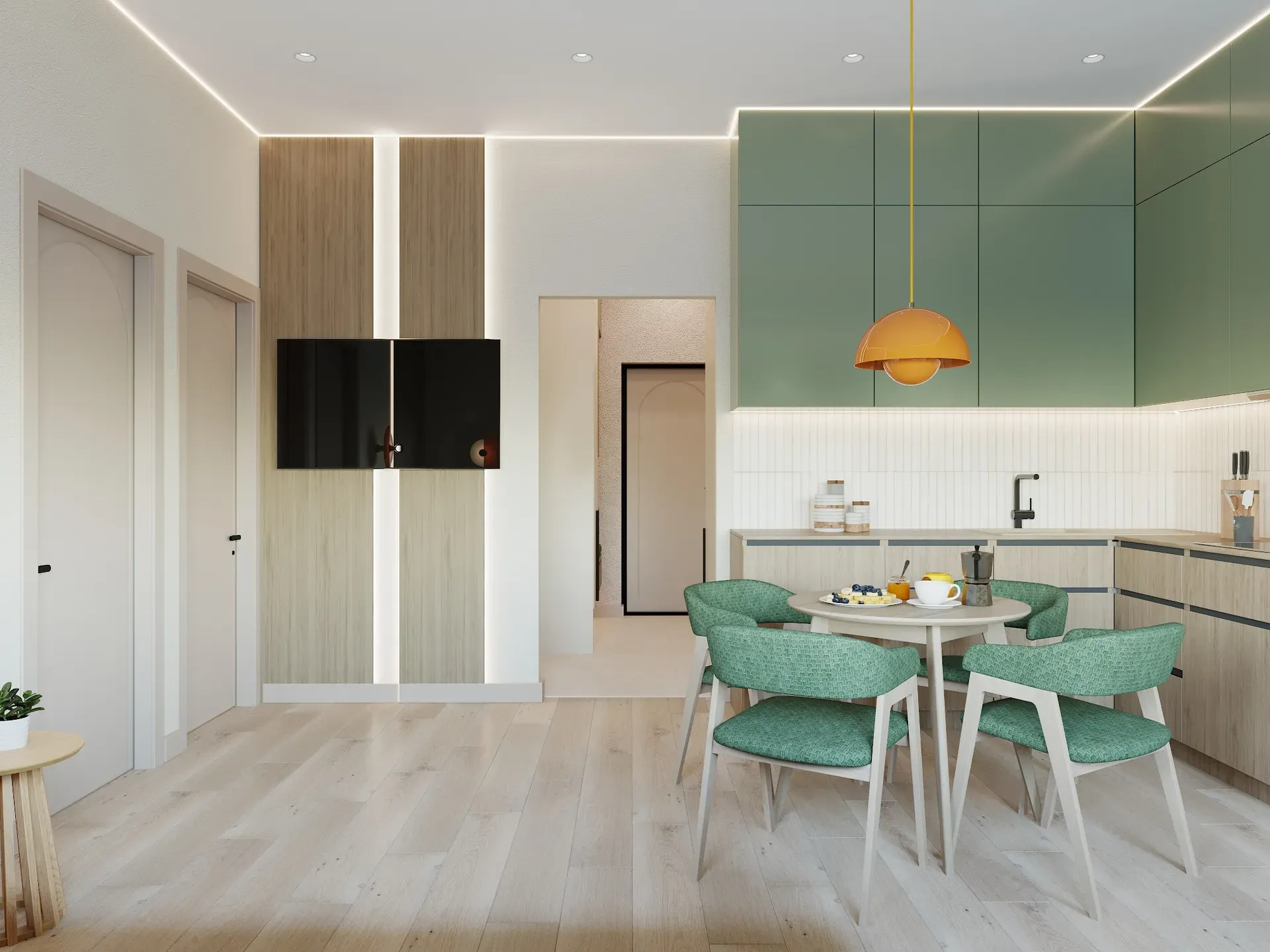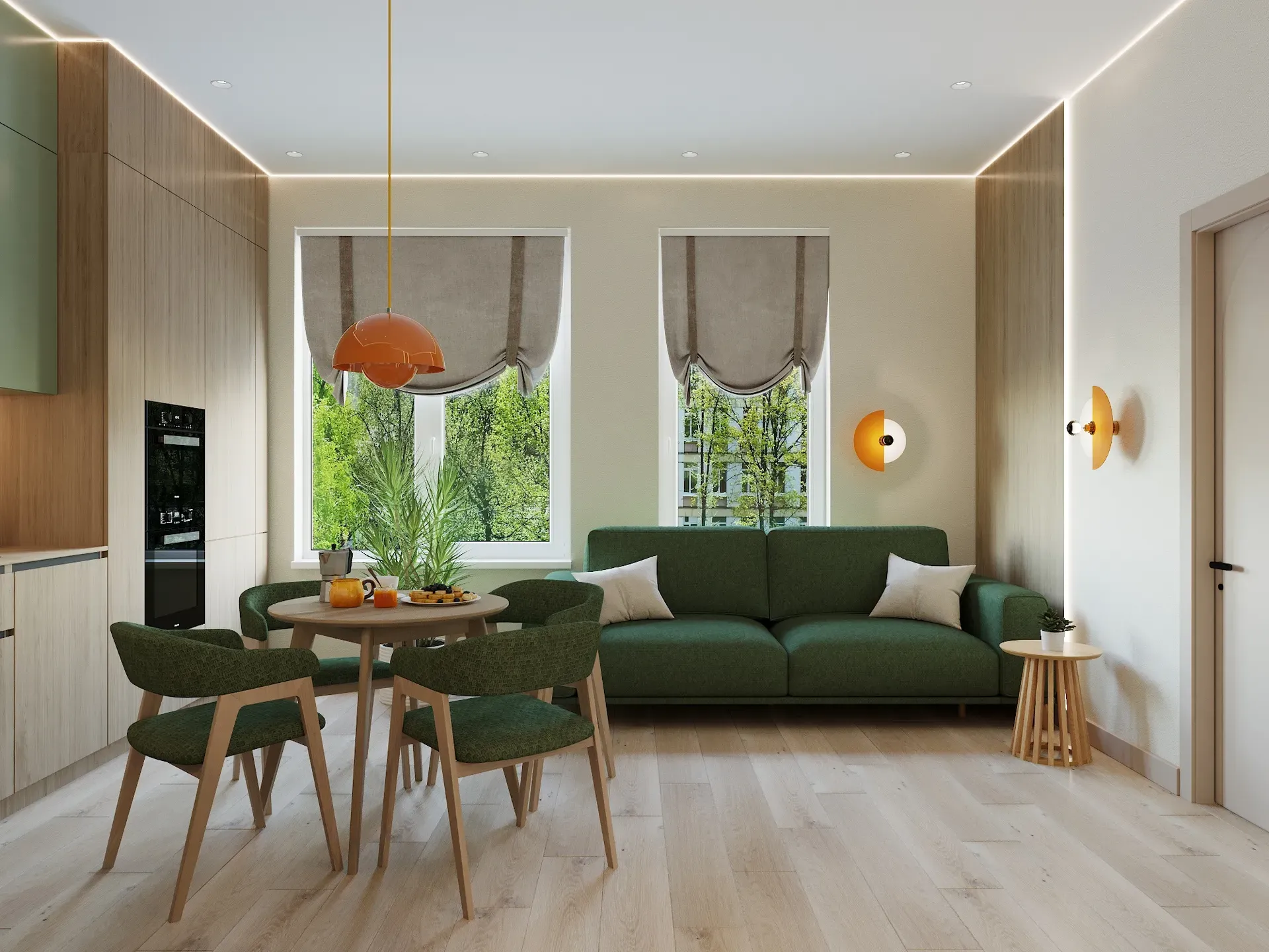 Заказчица озвучила пожелание: «Элегантный, спокойный минимализм, эко-стиль». Чтобы визуально расширить небольшое пространство, мы использовали следующие приемы: