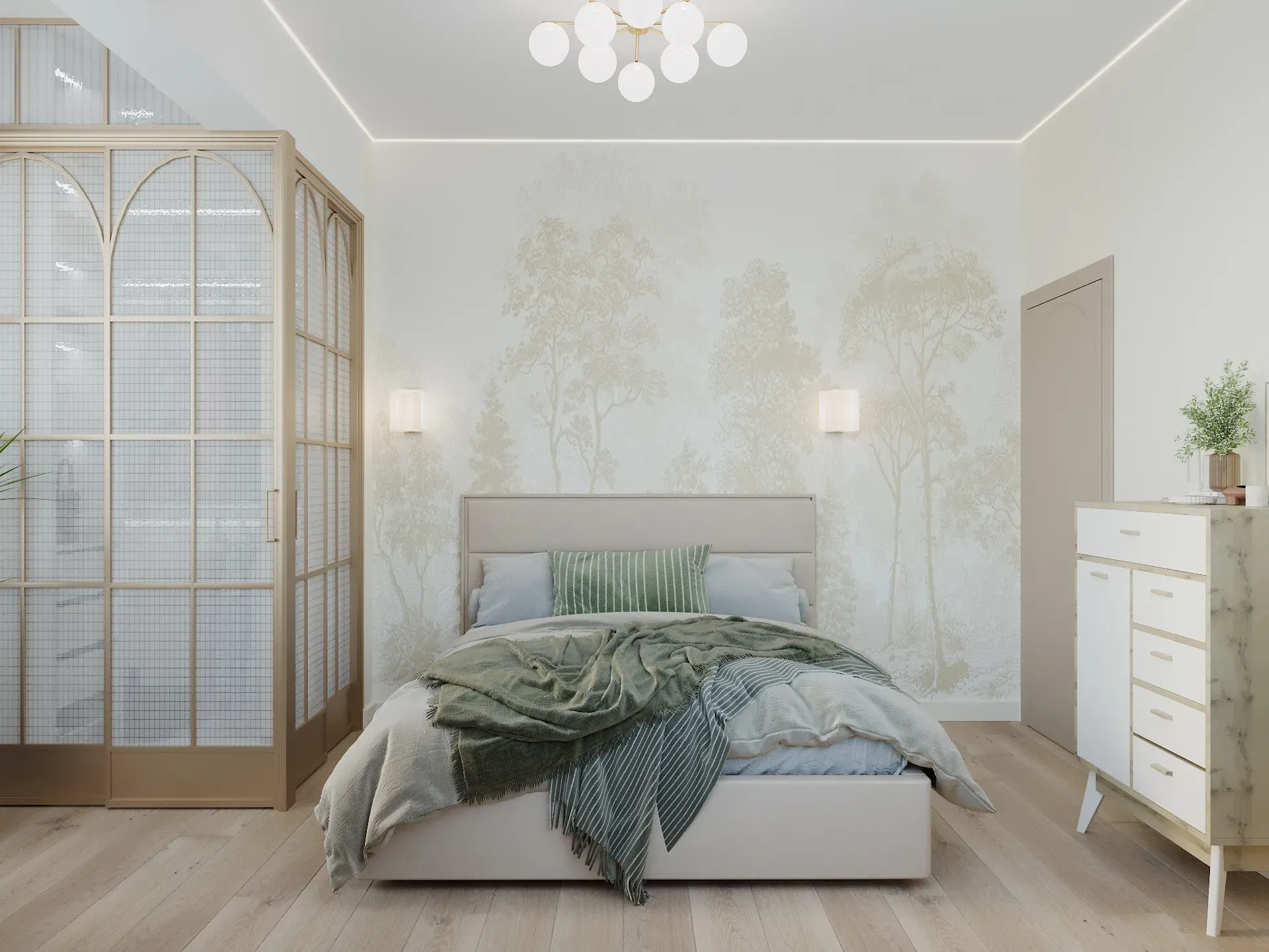 Работа с текстурами: Чтобы светлый интерьер не казался «больничным», мы добавили тактильные материалы: дерево на полу, текстиль с выраженной фактурой, мягкие изголовья кроватей.