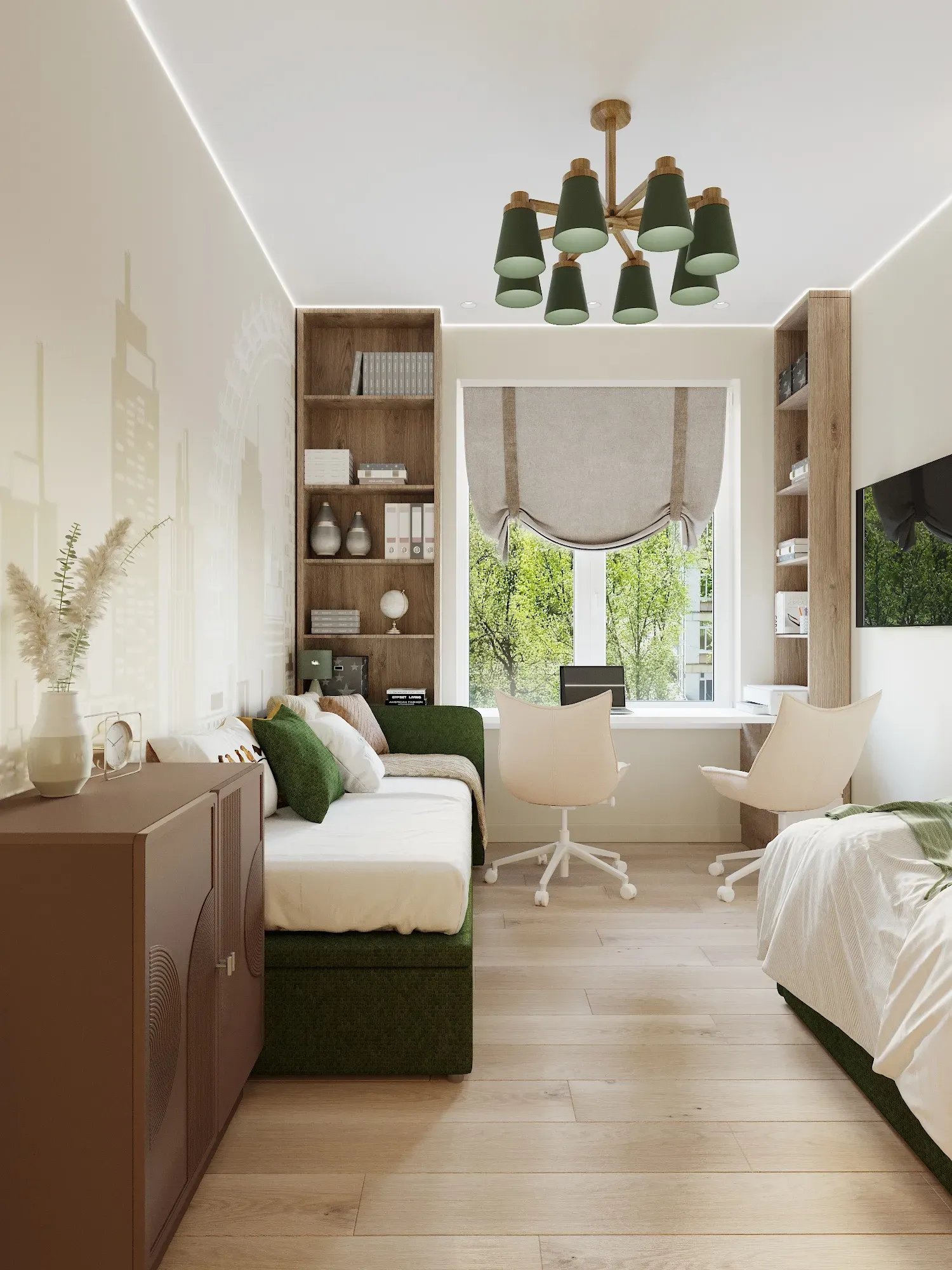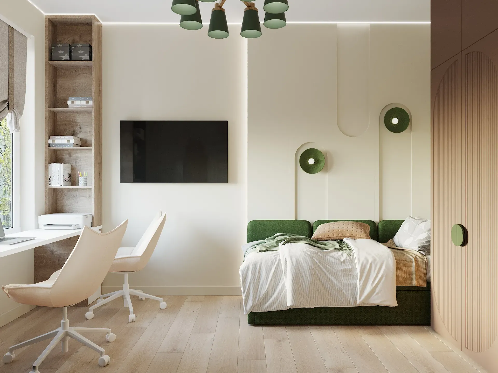 Детская комната (12,3 м²): Самая сложная логистическая задача — разместить двоих детей на 12 квадратах. Здесь каждый сантиметр работает на функционал. Мы использовали вертикальное зонирование (или двухъярусные решения/разнесенные кровати), чтобы освободить место для игр на полу. Рабочие места организованы у окна для доступа к естественному свету.