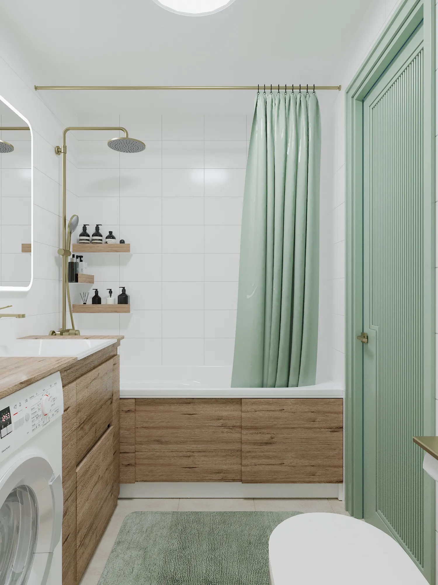 В маленьких квартирах часто отказываются от ванной в пользу душевой кабины, чтобы поставить стиральную машину. Мы же сохранили ванну длиной 1700 мм. Это повышает статус квартиры, так как многие арендаторы принципиально ищут варианты с ванной. Стиральная машина размещена под единой столешницей с накладной раковиной. Это классическое, проверенное временем решение для экономии места. Над инсталляцией предусмотрен шкаф для бытовой химии, закрывающий коммуникации.