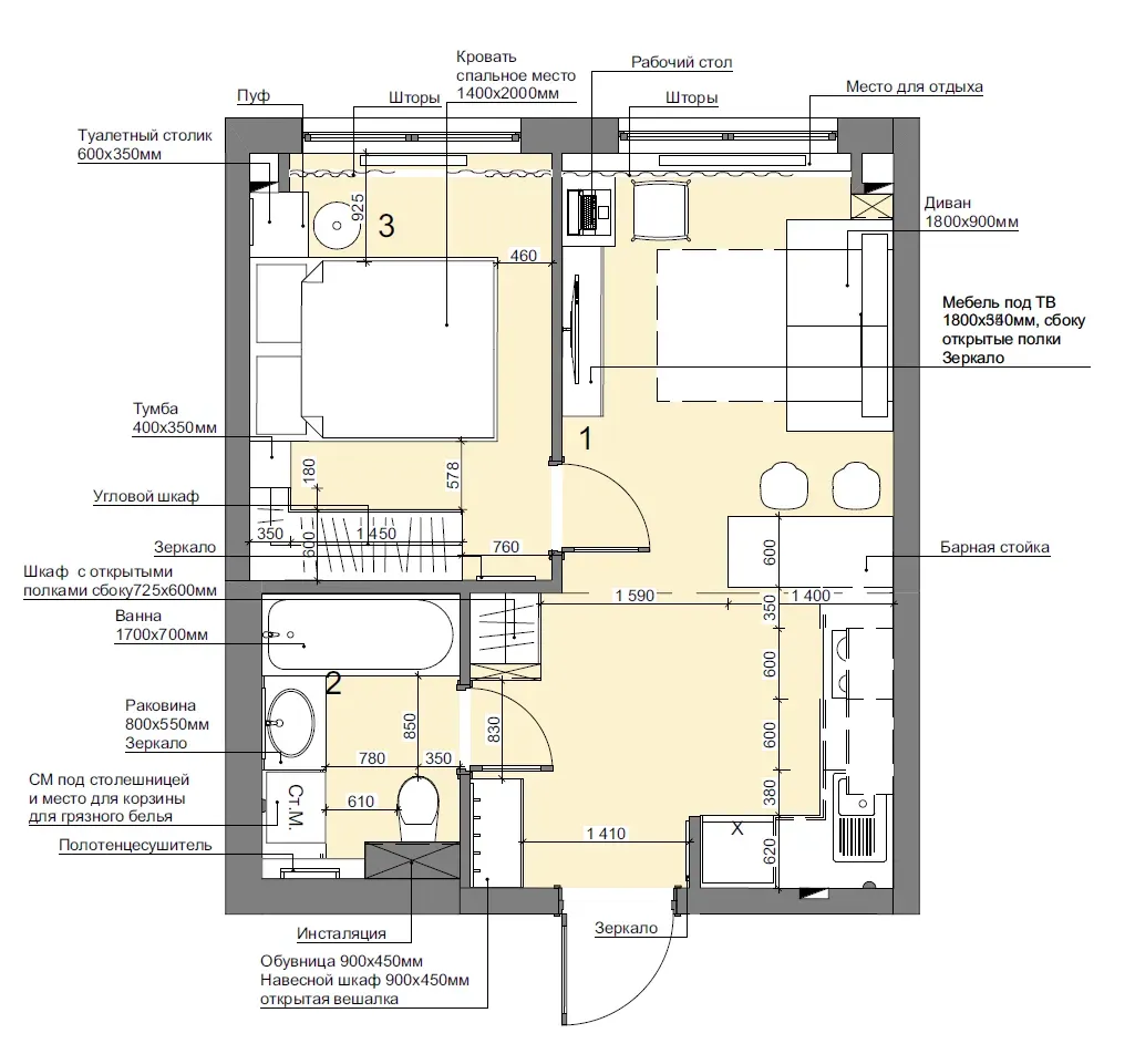 Помещение площадью 19,3 м² зонировано таким образом, чтобы «мокрые» процессы кухни не мешали отдыху.
