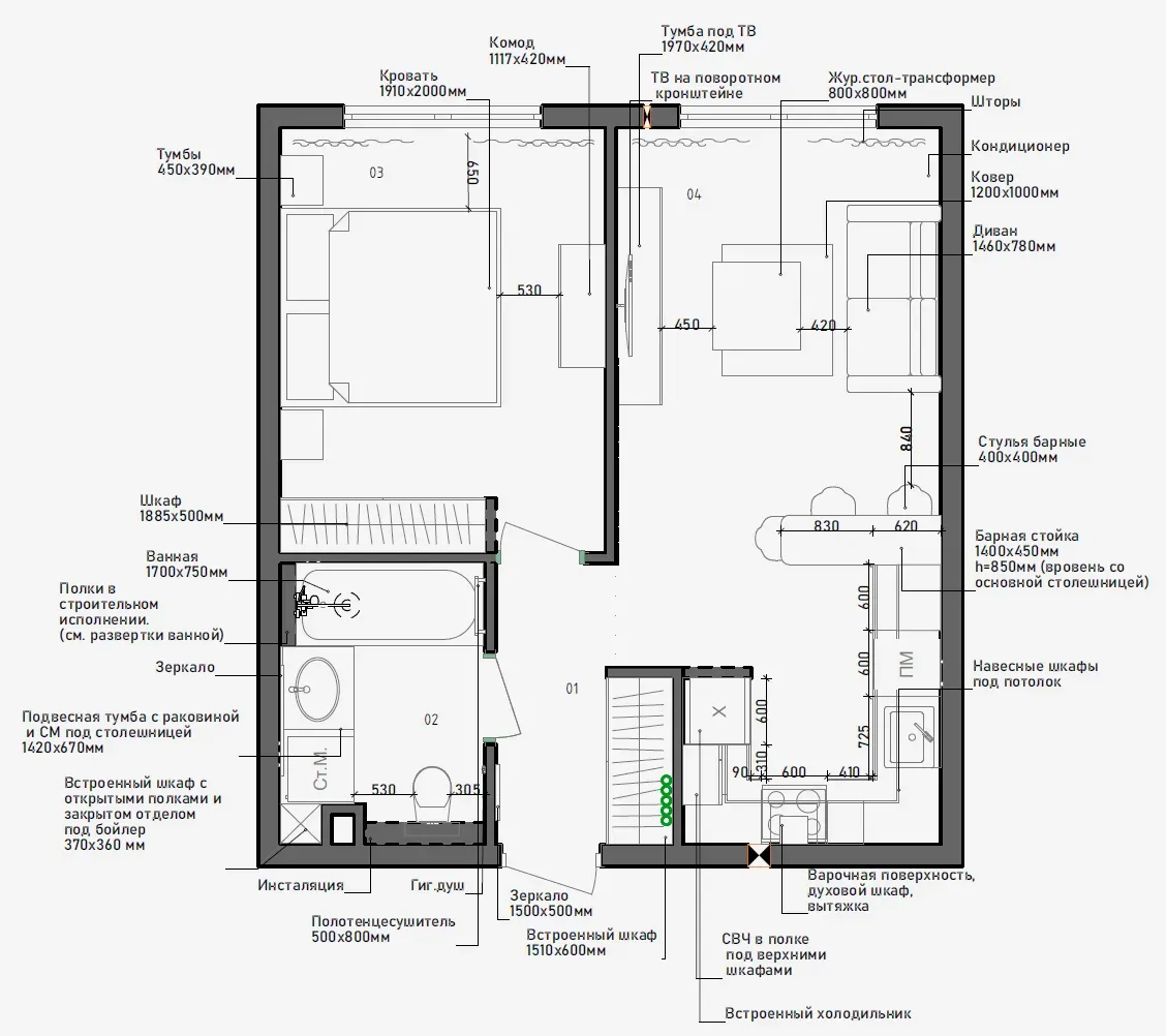 В санузле спроектирована принудительная вытяжка, подключенная к отдельной клавише выключателя. Это критически важно для предотвращения появления плесени. Также продуманы места установки кондиционеров, чтобы потоки холодного воздуха не были направлены на диван или кровать.