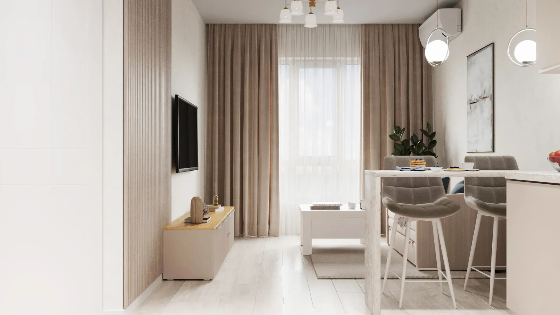 Напротив кухни расположилась гостиная зона. Здесь достаточно места для полноценного дивана и ТВ-группы. Мы предусмотрели проход шириной не менее 90–100 см между кухней и диваном, чтобы можно было свободно перемещаться даже при открытой дверце посудомойки.