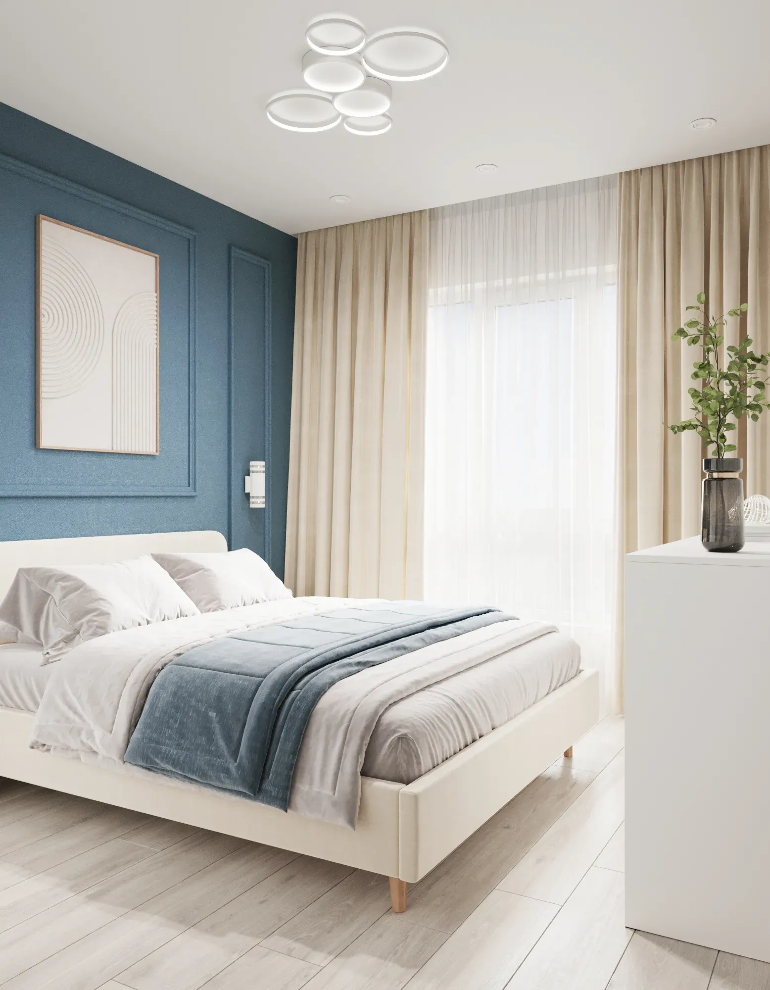 Кровать: Центр композиции — двуспальная кровать с мягким изголовьем. Мы не стали экономить на размере спального места ради проходов, ведь качество сна — это приоритет.