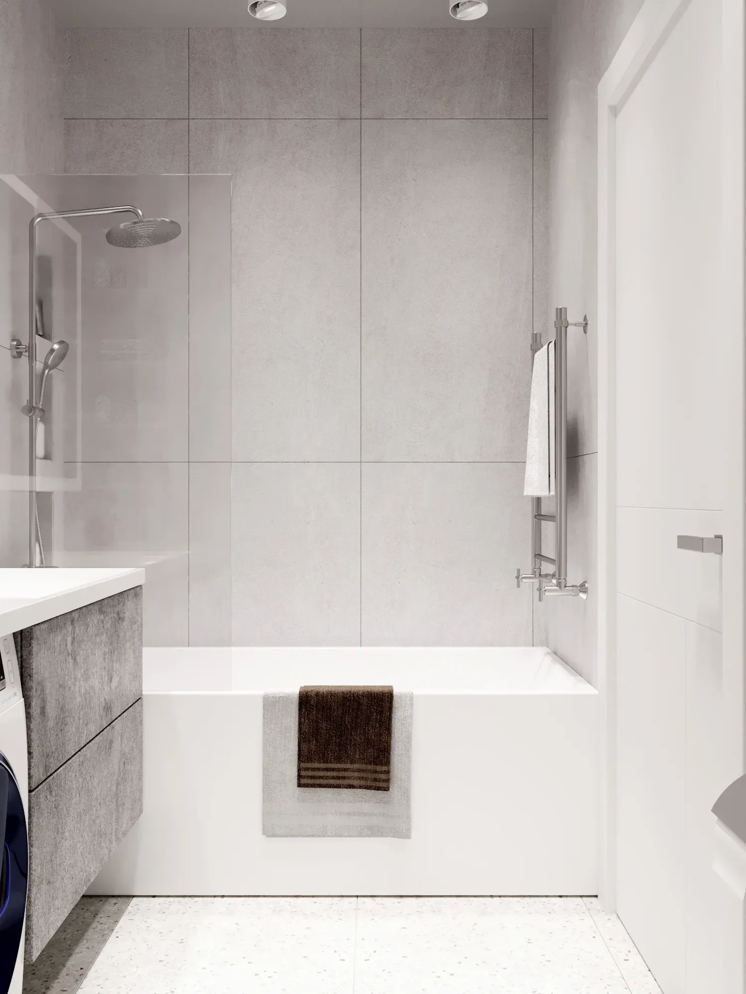 Санузел площадью менее 4 м² требовал ювелирной работы. Именно здесь сконцентрирован основной бюджет на инженерию и сантехнику. В соответствии с пожеланиями заказчика, мы полностью отказались от темных и черных элементов. Ставка сделана на сияющий хром и светлую керамику. Это беспроигрышная классика, которая всегда выглядит свежо и опрятно.