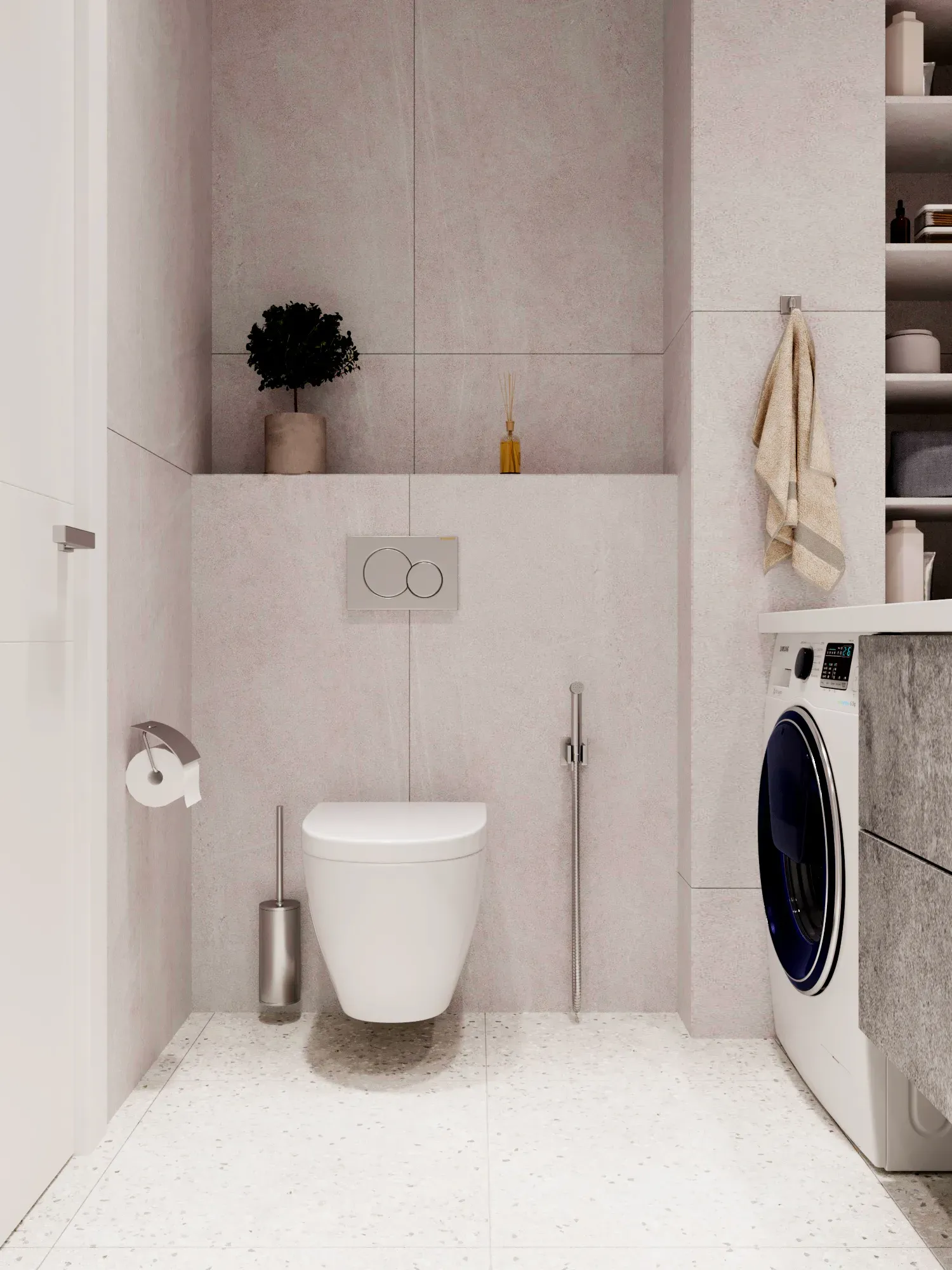 В условиях ограниченного места биде поставить невозможно. Его функции берет на себя гигиенический душ DK Bayern (модель Liszt). Мы предусмотрели модель скрытого монтажа: все коммуникации спрятаны в стене, снаружи остается только аккуратная лейка и рычаг управления. Это стандарт современного жилья комфорт- и бизнес-класса.